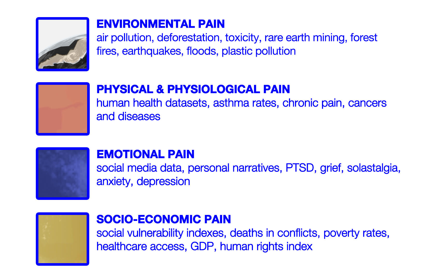 ‘’Planetary-Personal-Pain’’ (PPP) takes the form of an interactive pain map, visualizing the entanglement of ecological destruction, socio-economic fragility, and human suffering. Drawing on data from social media expressions of pain, medical health datasets, GDP statistics, and environmental records, phantom scars emerge as craters on the Earth’s surface, each sonified through the five elements of Traditional Chinese Medicine - Wood, Fire, Earth, Metal, and Water. Participants’ narratives of pain are integrated into this planetary cartography, encouraging reflection on the ongoing impact of ecological and health crises. Users share their personal narratives of pain, adding depth to the collective and lingering pain corresponding to environmental distress in different countries.