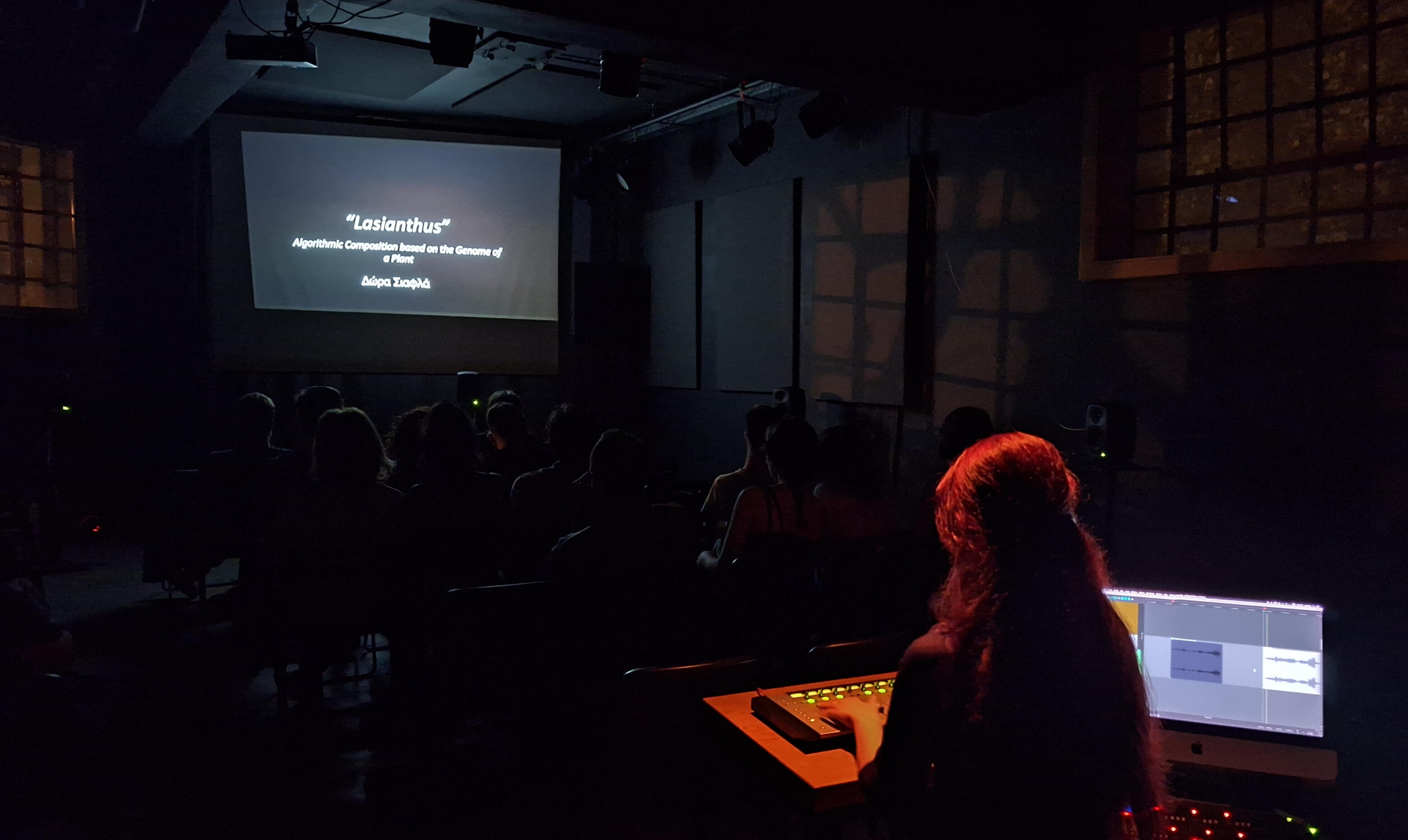 Lasianthus was presented as a live spatial sound performance. The audio played through eight speakers, with the audience standing in the center. During the event, the volume of each speaker was adjusted in real time, shaping how sound moved through the space.