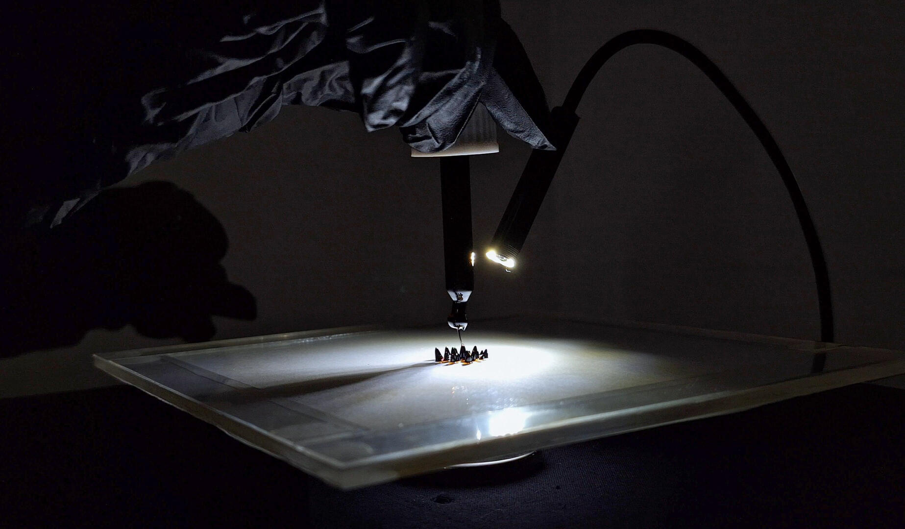 The work draws from the principles of biosemiotics, specifically the idea that life is based on codes and signs.At its core is the cell, around which the installation is developed. This research suggests an understanding of ''semiosis'' as an intrinsic process of the body, arising through its continuous relation to the surrounding environment. The world is shaped by continuous exchanges of signals, many of which remain unseen to human perception. Cells respond to chemical signals, plants transmit information through their roots, and animals communicate through movements, sounds, and colors. If every structural element carries an imprint of meaning within it, then the body, the environment, and information form an inseparable field.The interactive structure is activated by touching a biometric sensor for an extended period. Within a small square frame, a black droplet of magnetic fluid transforms, forming shapes reminiscent of cells. As the form settles, it leaves behind a trace of a residual mark, akin to blood. Above the droplet, a small camera captures these transformations. The images are projected on a large scale onto the wall. Simultaneously, the changes in the form of the droplet cell are translated into sound, creating an acoustic environment that evolves in real-time.